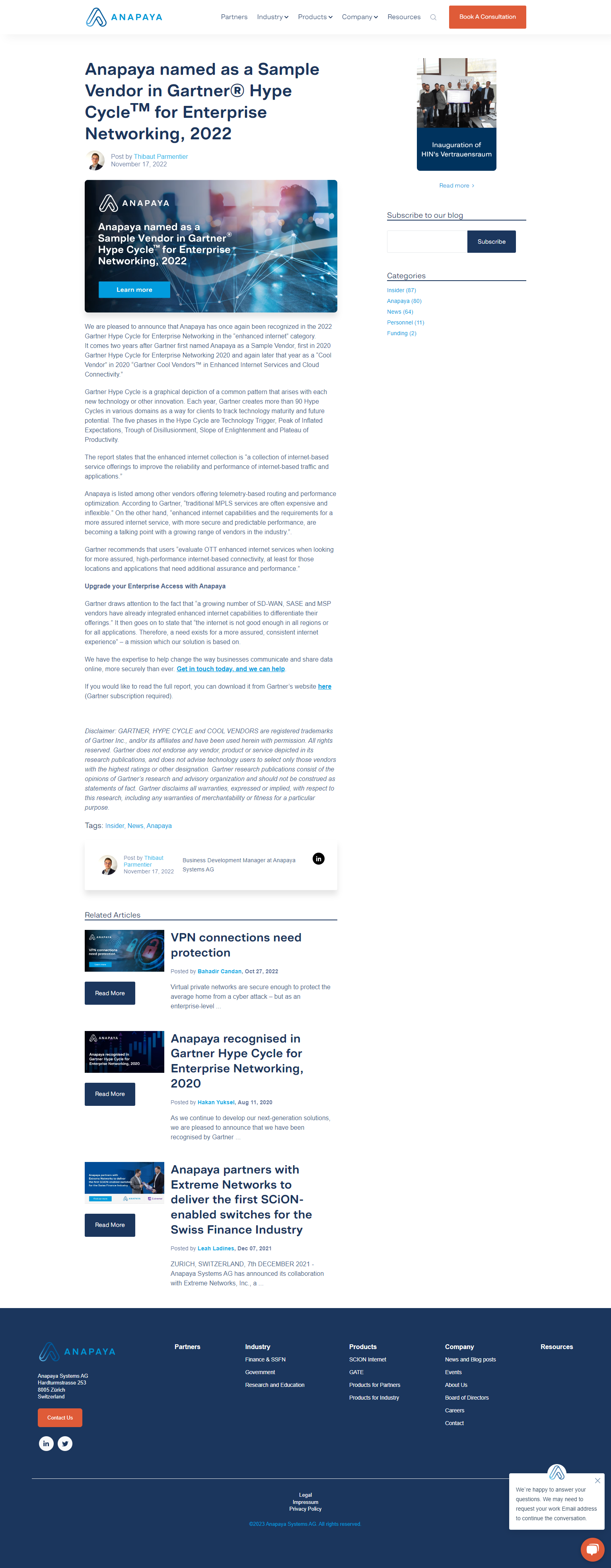 Anapaya named as a Sample Vendor in Gartner® Hype Cycle™ for Enterprise Networking, 2022 Last updated on May 3, 2023 ArticleNovember 2022 Previous The danger of using public internet: the most at-risk industries in 2023 - Anapaya Next What you need to consider when buying cyber insurance - Anapaya